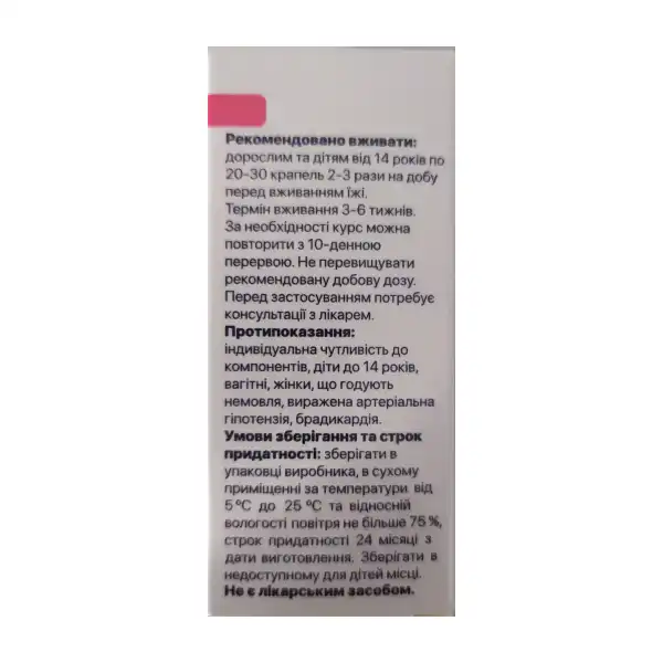 Приймати 10-15 крапель, розчинених у 100 мл води, двічі на день перед їжею. Курс застосування – 30 днів. При необхідності курс можна повторити після перерви.